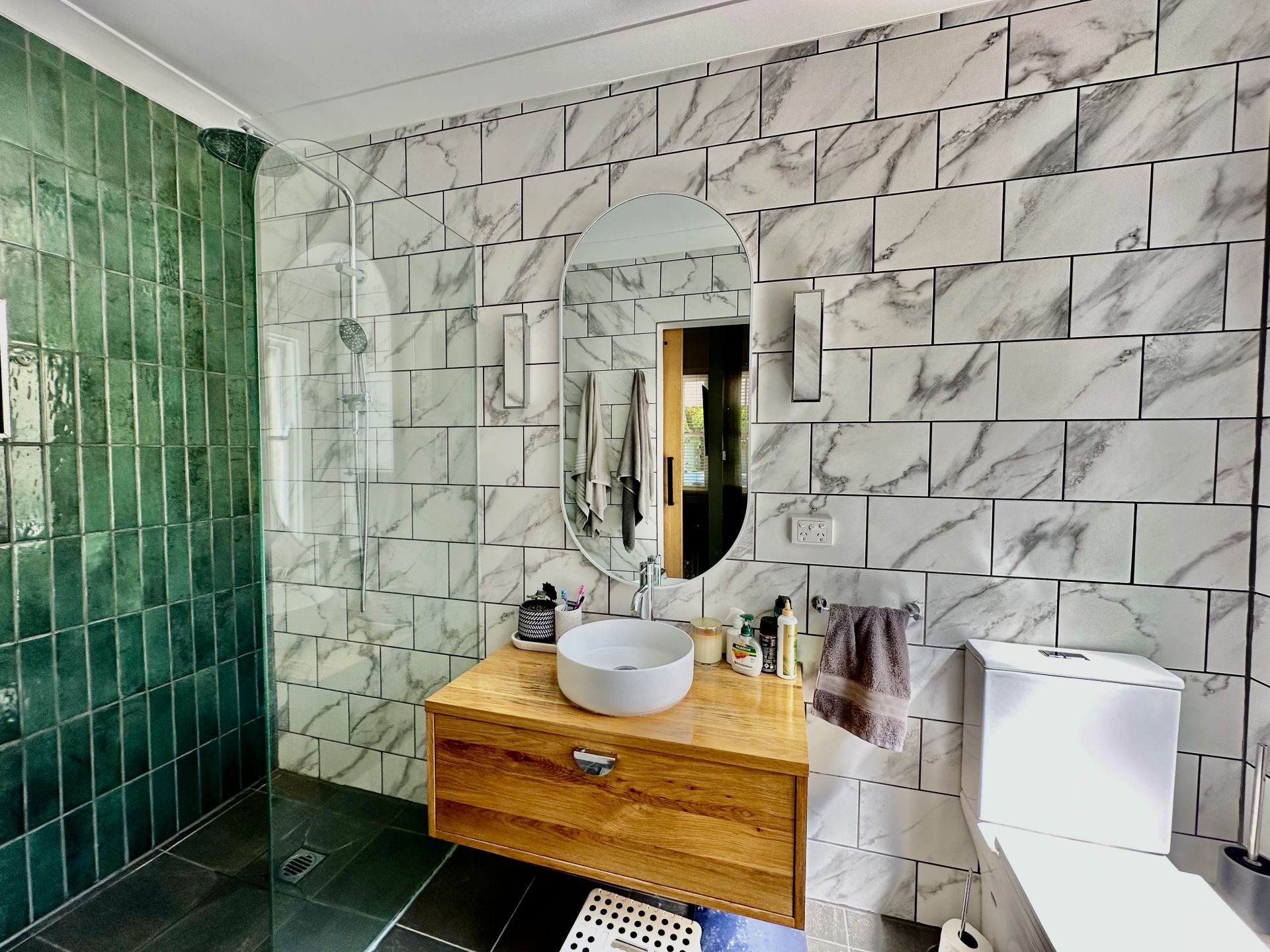 - Bathroom with bath and shower