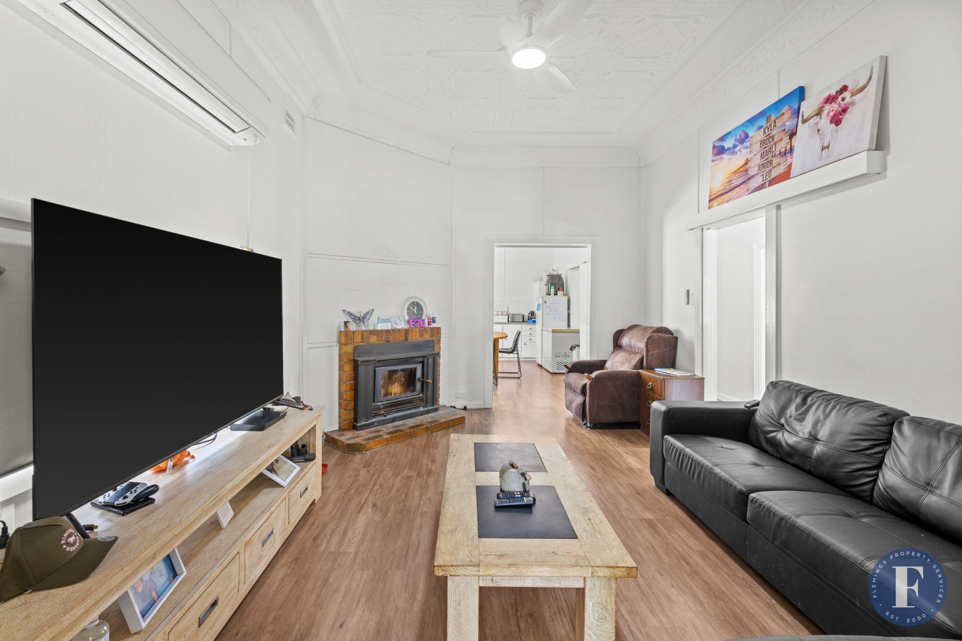 - Living room featuring a wood fireplace and split system air conditioning