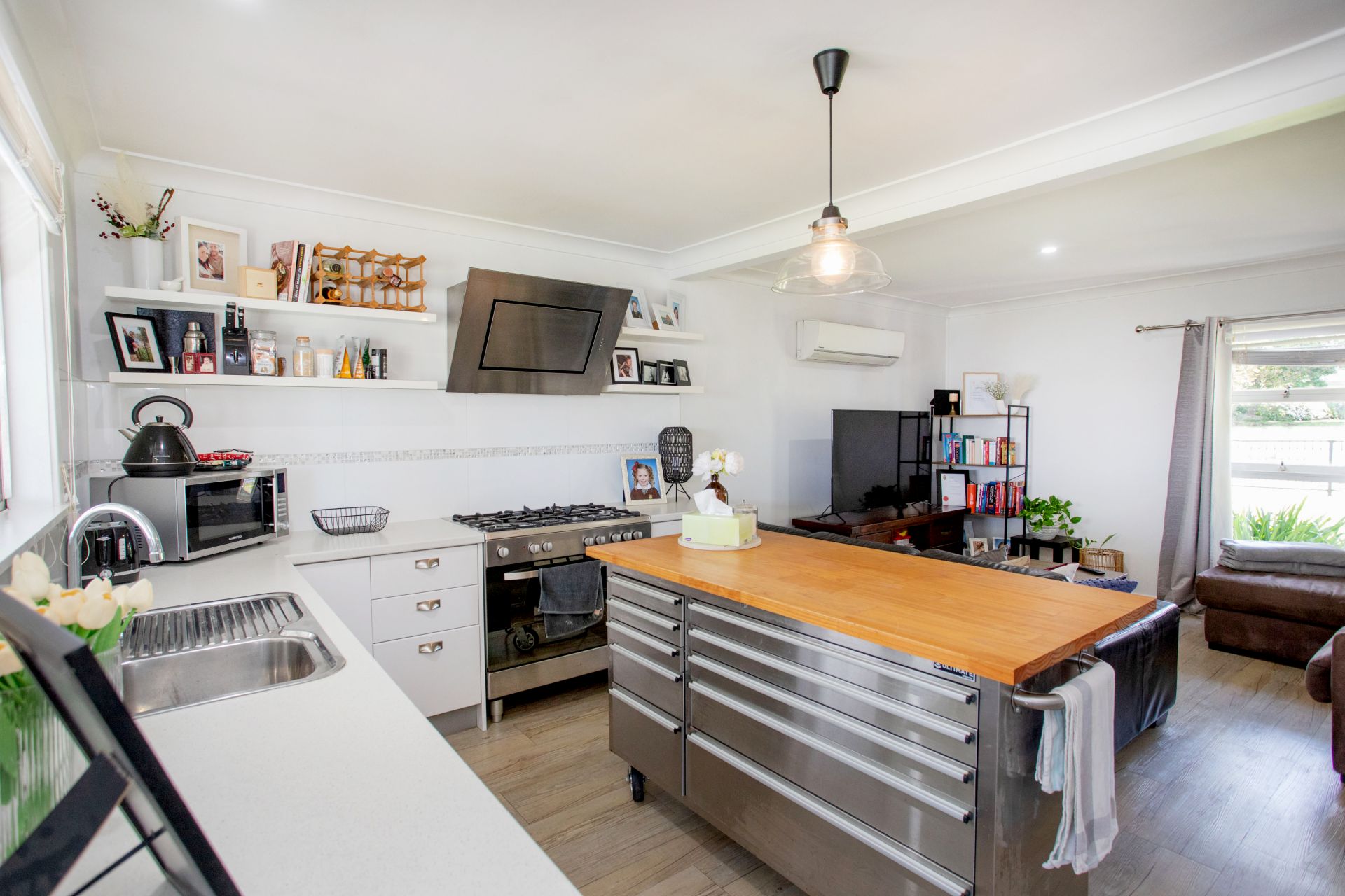 - A well appointed kitchen featuring a 900mm stainless steel gas stove with matching range hood, the dishwasher and island bench area are also finished in matching stainless steel