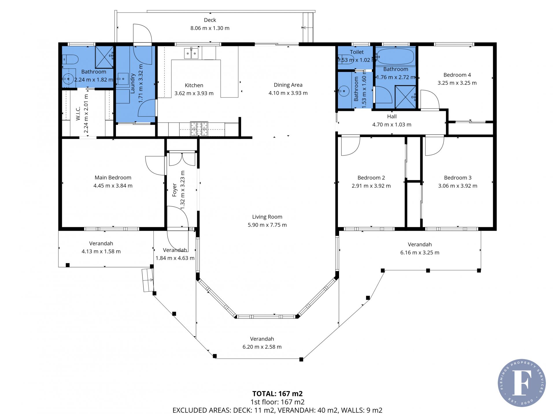- Four bedrooms, three with built-in wardrobes and the main featuring a walk-in robe and ensuite