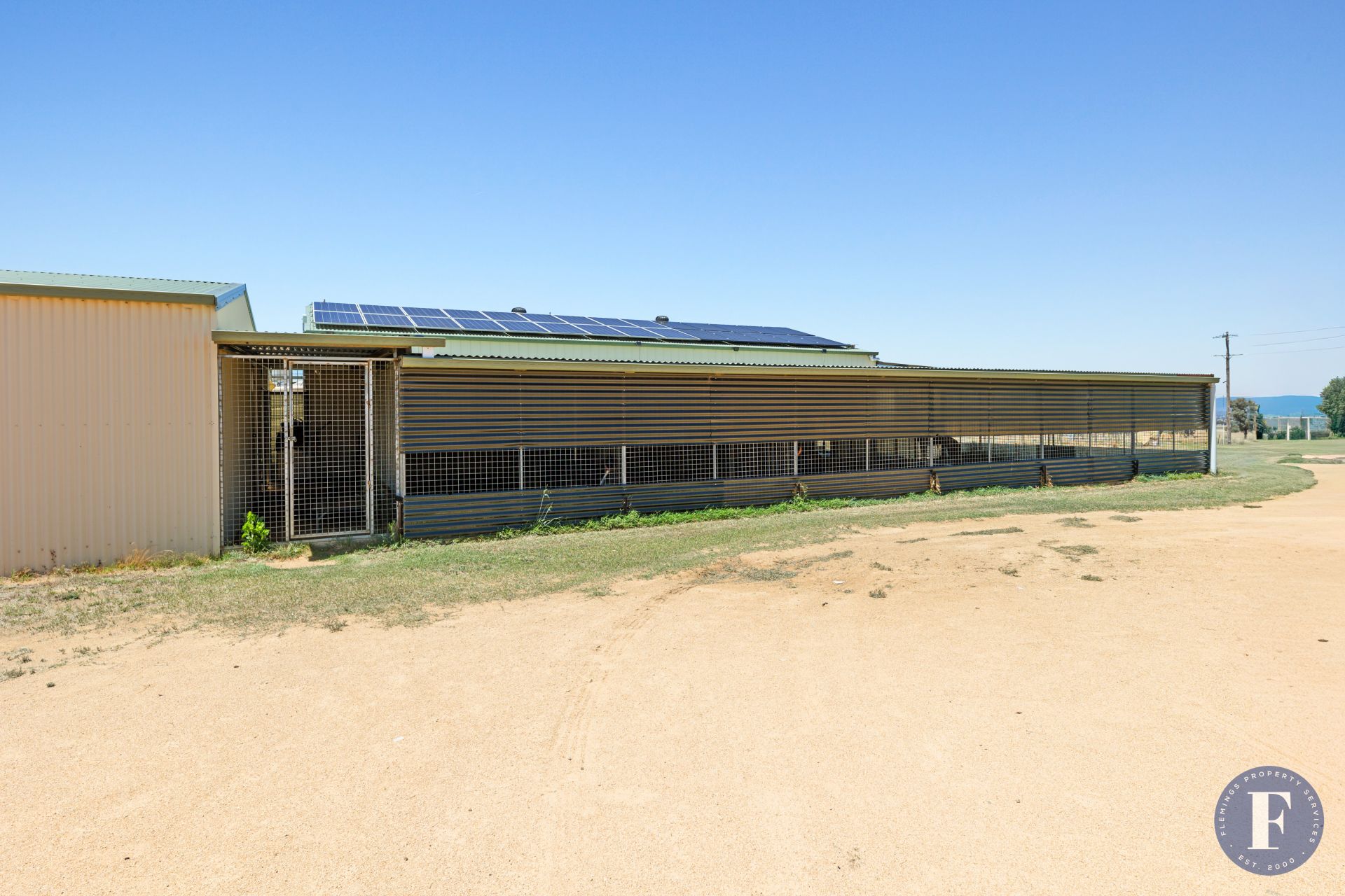 - Large main shed currently utilised for greyhound training, fitted with eight kennels, kitchen and toilet facilities, plus a further six yards and walkway under the adjoining skillion