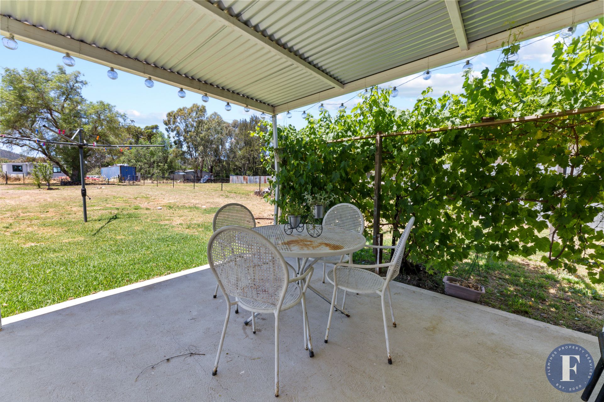 - Lovely gardens with large established shade trees, numerous fruit trees, and a charming grapevine that drapes over the patio area