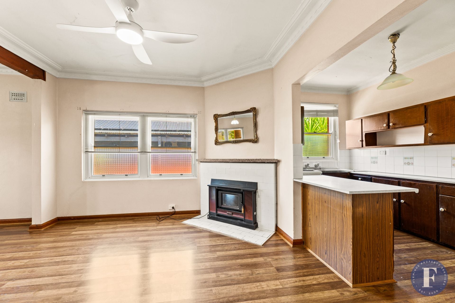 - Open-plan living area with wood heater