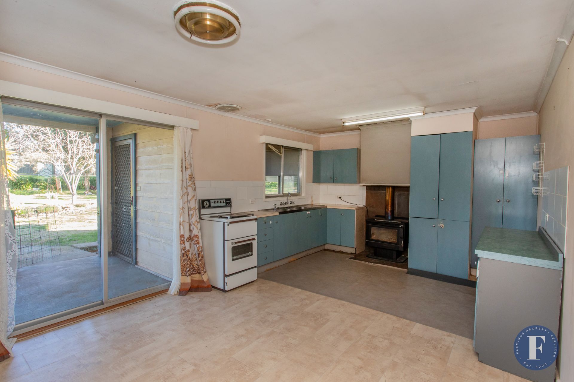 - Combined kitchen and dining area with slow combustion wood heater