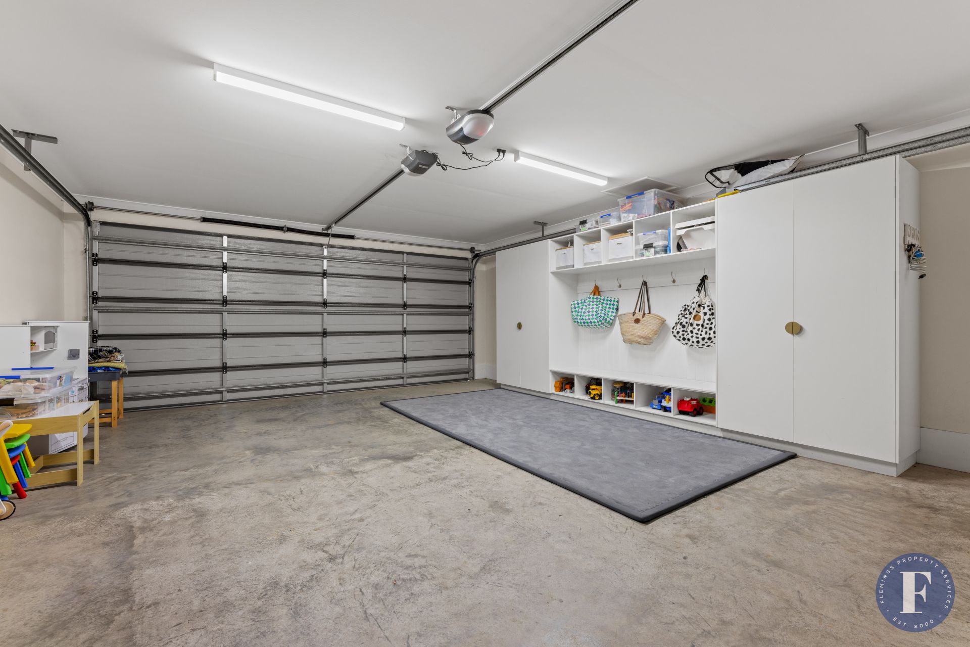 - Double garage – Electric roller doors at both ends, internal access to the home, and loads of custom storage