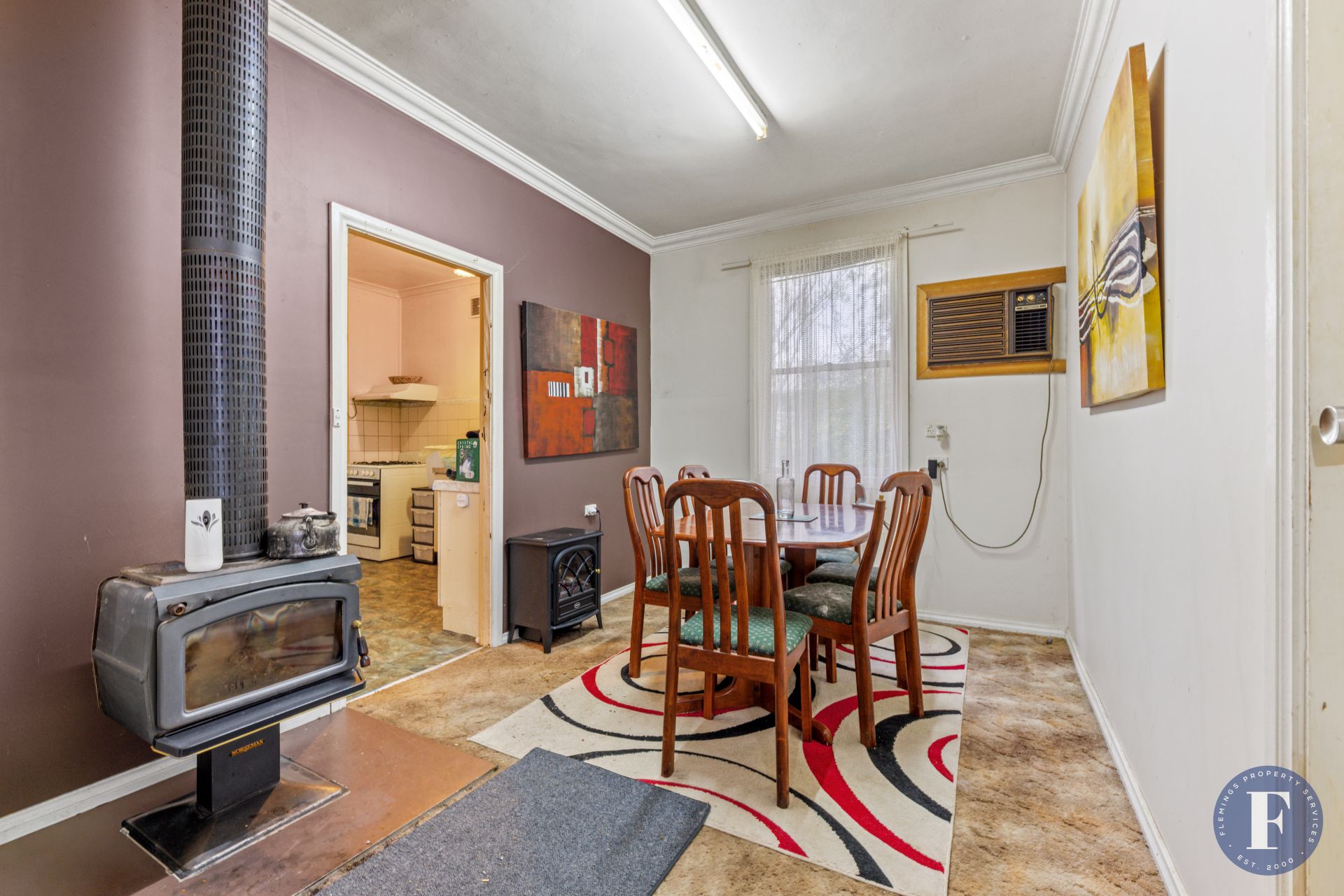 - Conjoined living and dining featuring a wood heater and window box air conditioning